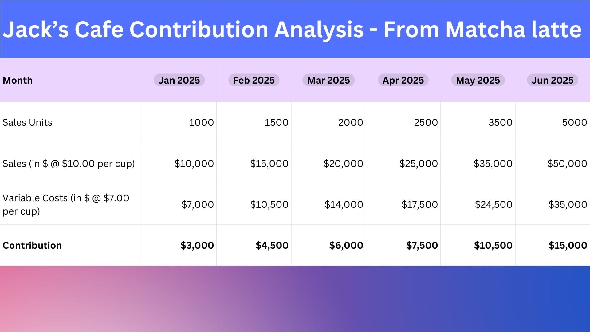 In our example above, Jack was selling a cup of Matcha Latte at $10. If he increases the pricing to $15, his contribution (assuming variable costs remain the same), will be