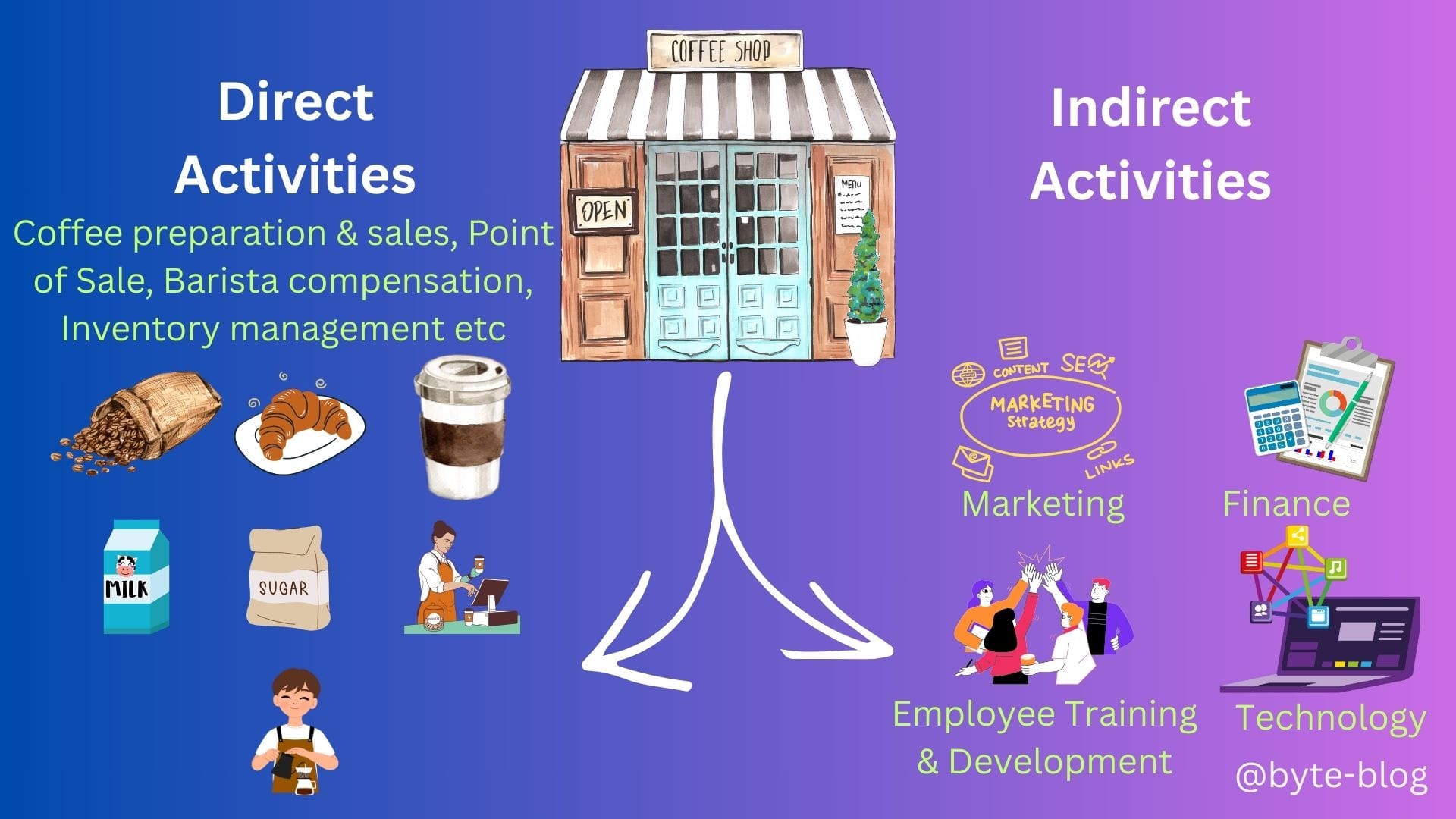 So, income (revenue) or expenses (spends) can relate to any of the above. What are the direct & indirect activities for a coffee shop? Let's visualize them as below :