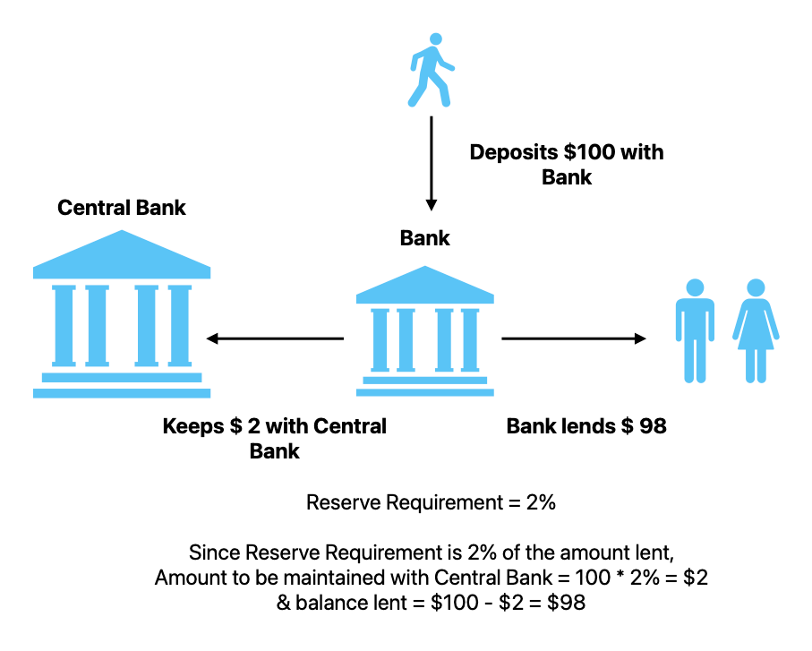 Assuming the Central Bank regulations require banks to hold reserves of 2% of their deposits, it means they have to hold either with themselves in their vaults or with Central bank, 2% of $100 = $2.