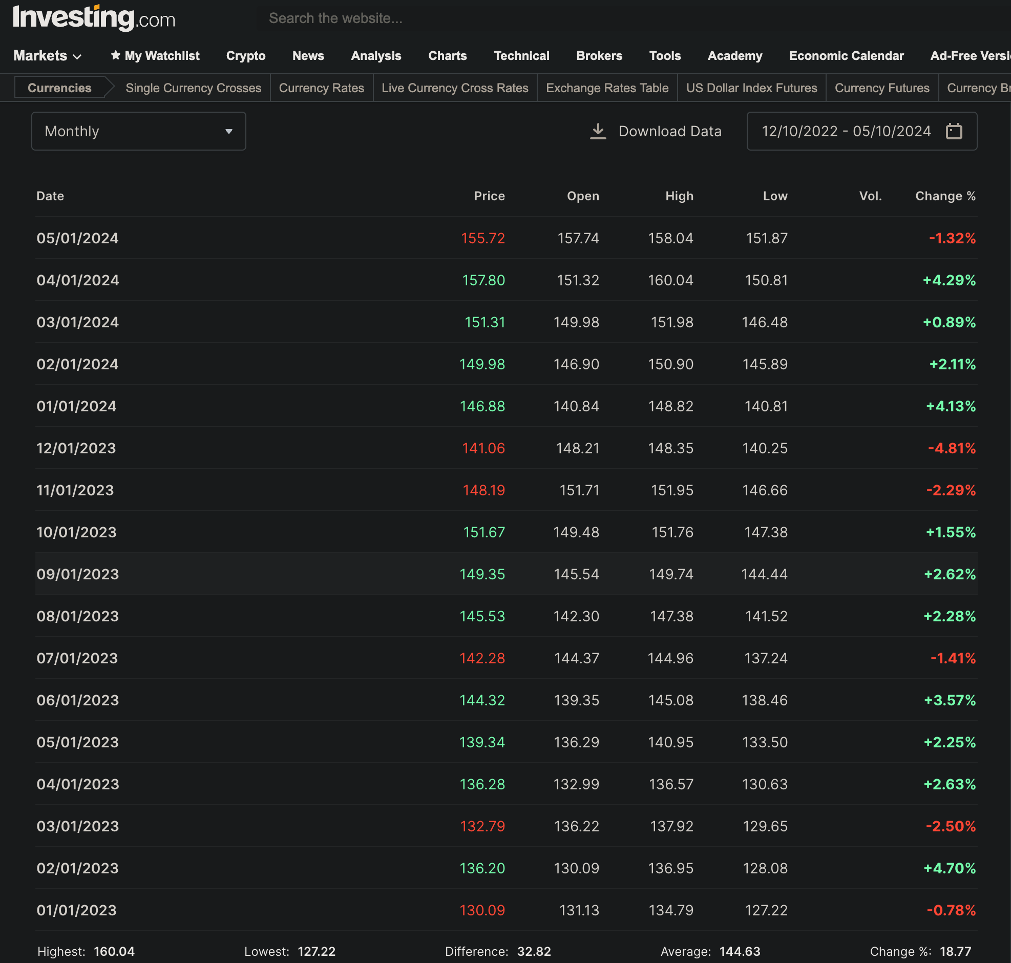 It was this wave of sell-ofs that drove the currency down to 160 Yen to the dollar for the first time since 1990. From the above, we can see how interest rate expectations triggered volatility in exchange rates & weakening of the Japanese Yen. The market expected BoJ to increase rates which didn't happen resulting in huge sell-offs further weakening the Yen.