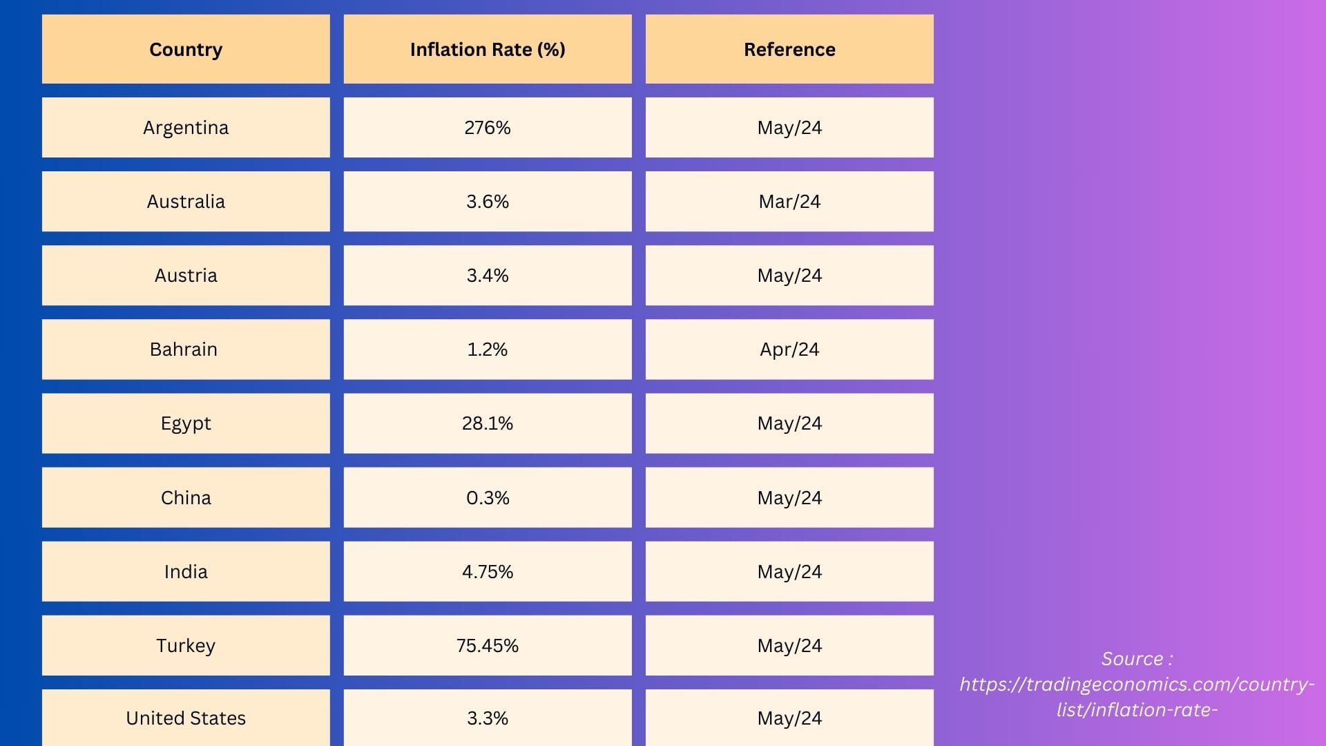 We see that the inflation numbers vary from 276% in Argentina to 0.3% in China. There are also some countries with double digit inflation - Egypt at 28.1% & Turkey at 75.45% while others are in single digit inflation.