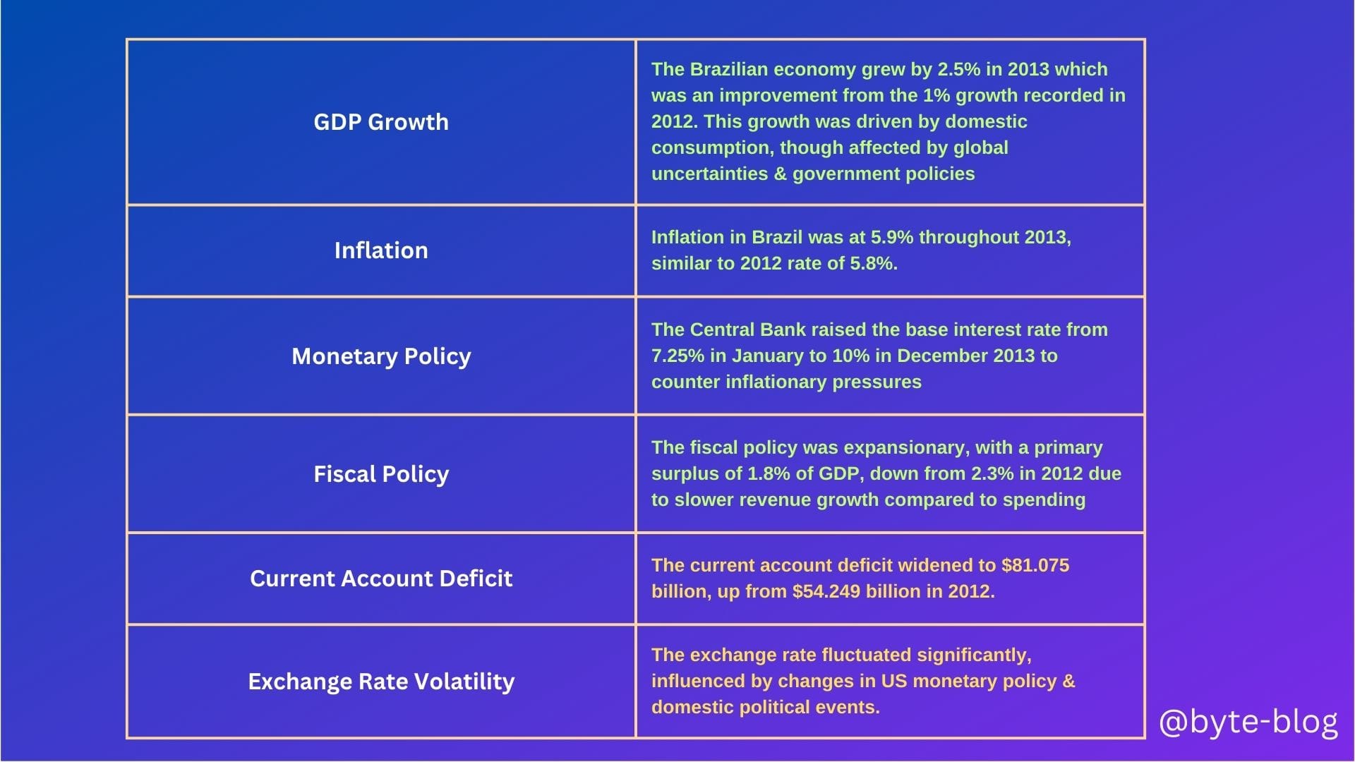 - Brazil was recovering from a slowdown (shown by 1% growth in 2012), but it still was not out of the woods yet. But the recovery was not driven by increase in investments for the future but domestic consumption. The economy was dependent on consumption driven growth while investments & net exports had fallen (denoted by increase in current account deficit).