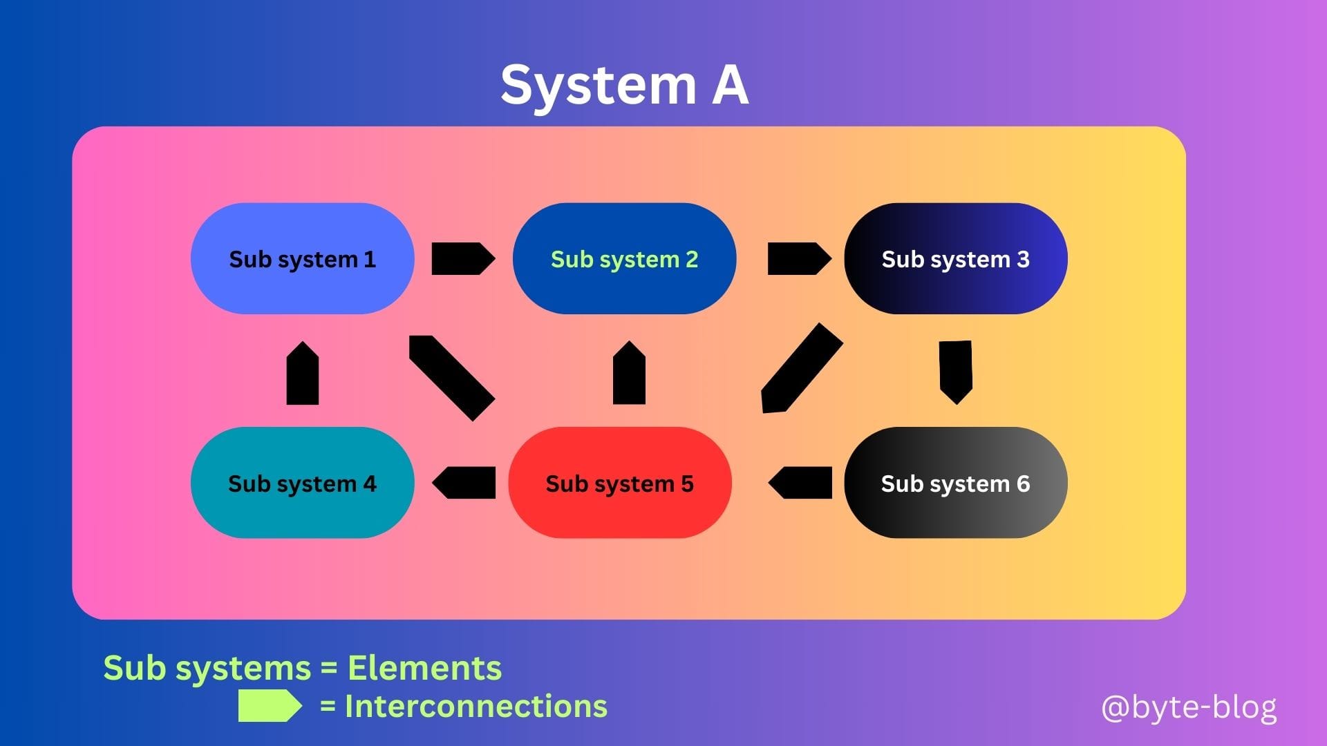 To put it simply, different units or sub-systems (Elements) interact with each other through connections between them (Interconnections) to achieve a goal or objective (Purpose).