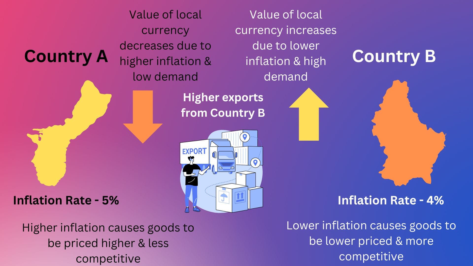 Goods produced in a country with higher inflation cost more to produce & hence is less competitive compared to goods produced in countries with lower inflation which are produced at lower cost.