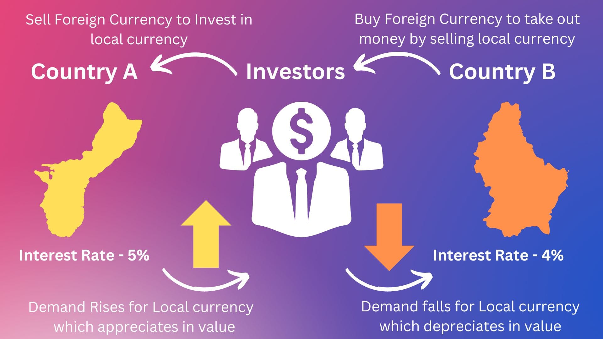 A country with higher interest rates (ignoring inflation) would experience higher inflow of foreign currency compared to that with lower interest rates mainly due to higher return. This increases the demand for currency with higher rate compared to that with lower rate causing it to appreciate.